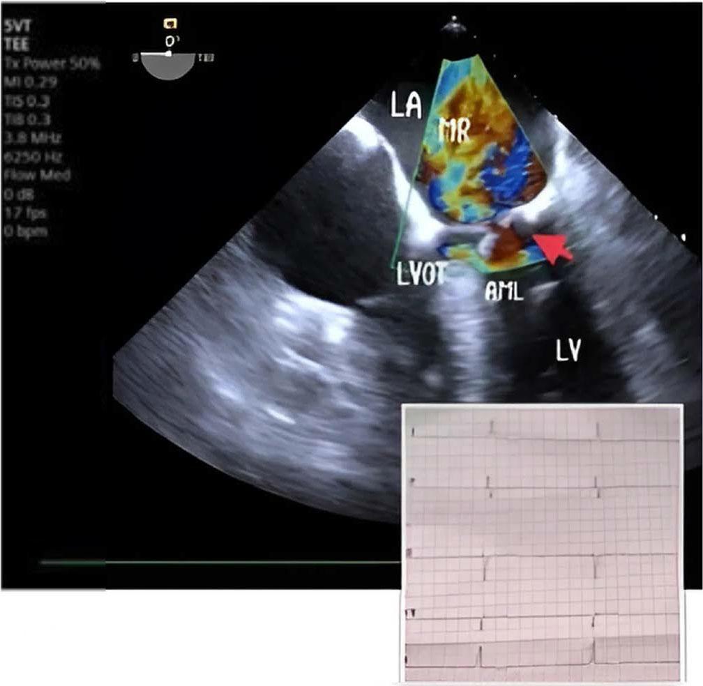 Severe mitral regurgitation in junctional rhythm. MR mitral regurgitation, LA left atrium, LV left ventricle, LVOT left ventricular outflow tract, AML anterior mitral leaflet