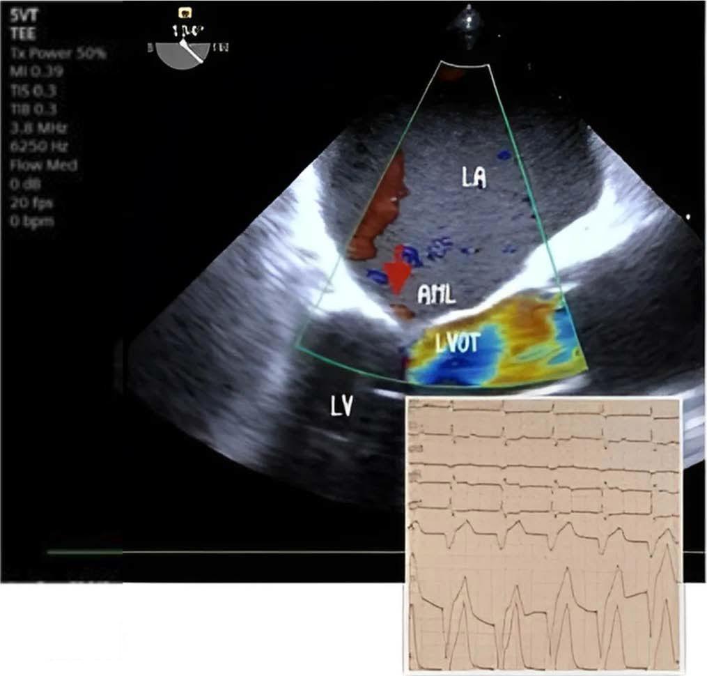 Upon admission to our hospital, the patient was experiencing severe respiratory failure and was promptly transferred to the intensive care unit (ICU). Oxygen saturation levels fell to 50% despite ventilation support through a face mask. Given this critical condition, the decision was made to intubate the patient for mechanical ventilatory support. Unfortunately, even with this support, oxygen saturation did not improve, although blood pressure stabilized at an acceptable level of 100/60 mmHg. Due to a poor transthoracic echocardiogram (TTE) window, a transesophageal echocardiogram (TEE) was performed, which SAM of the mitral valve with severe mitral regurgitation (MR). Figure 2 Pressure gradient across the LVOT was 50 mmHg and the basal interventricular septum thickness was 12,5 mm. No segmental or global wall motion abnormalities were observed.