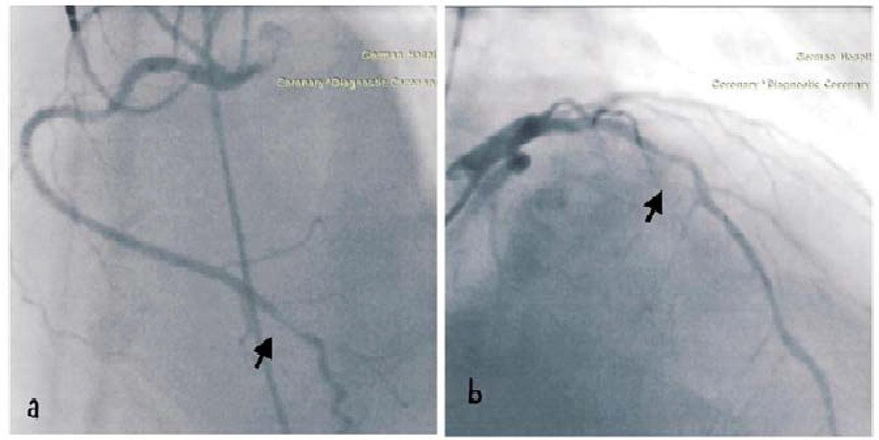 (a) Right coronary artery (RCA) distal tract stenosis (90%), (b) Left Anterior descendent artery (LAD) medial tract stenosis (75–90%)
