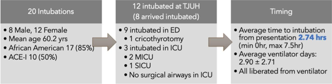 Twenty of the 50 encounters were intubated (ICU-intubated group) while the other 30 did not require intubation (ICU-nonintubated group) (Table 2 and 3). Intubations mainly occurred outside of the ICU (9 of 12 at TJUH) or before transfer to our institution (8). Only 3 intubations occurred in an ICU setting: 2 in the medical ICU and 1 in the surgical ICU. One patient required a cricothyrotomy, which was performed in the ED by our ENT team. The mean time from presentation to intubation was 2.74 hours (Min 0hr; Max 7.5hr). There was an average of 2.9 ventilator days after intubation and all patients were successfully liberated from the ventilator (Figure 2). No deaths occurred. One patient in this study possessed a chronic tracheostomy and did not require ICU stay, they were excluded from the intubation group.