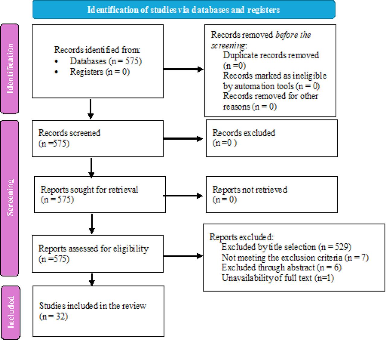 A total of 575 articles were initially screened, focusing on the title, abstract, and availability of full text for this scoping review. The search databases used were Web of Science (433), Scopus (112), PubMed (29), and CINAHL (1). Data extracted from the articles included the year of publication, study location, population size, diagnosis, use of the SFR, and outcomes. After applying the inclusion and exclusion criteria, 32 articles were included in the final review. Articles excluded during title selection primarily focused on medication effects on critical care diseases, therapeutic interventions for critical care disorders, or other parameters impacting oxygenation that did not specifically examine the SFR or PFR. After screening titles, abstracts were reviewed, leading to further exclusions of studies that did not align with our inclusion criteria. Only one article, initially deemed relevant based on title and abstract, was excluded due to the unavailability of the full text. The article screening process is outlined in detail in Figure 1.