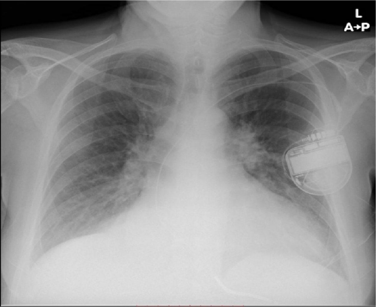 Chest radiography on admission: Marked cardiomegaly with increased interstitial markings, permanent ICD device in situ, without evidence of pulmonary consolidation or pleural effusion