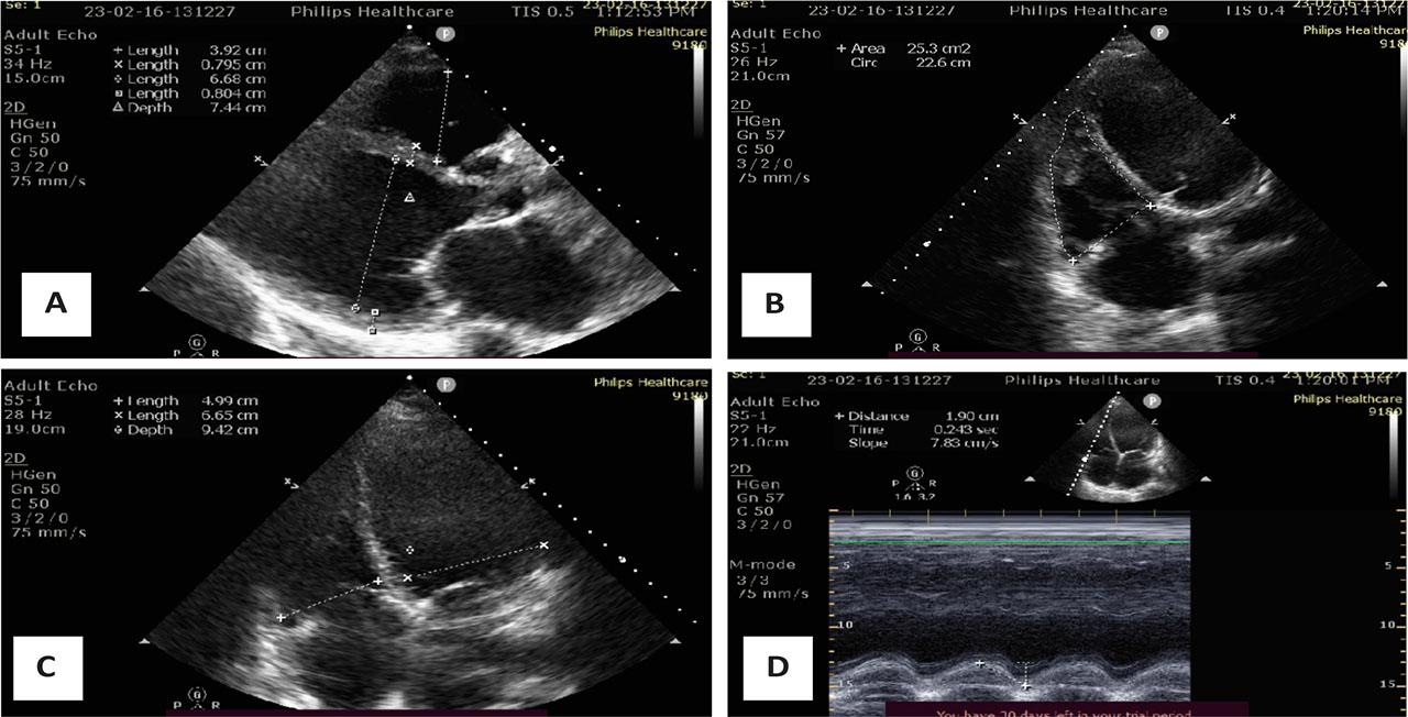 Transthoracic echocardiography on admission: A - Severely dilated left ventricle (LVEDD 66 mm), severely reduced ejection fraction (EF 21%); B - RV FAC – Right ventricle fractional area shortening (28%); C - RV/LV - mid linear dimension ratio in 4 chamber view (0,75); D - TAPSE – tricuspid annular plane systolic excursion (16 mm).