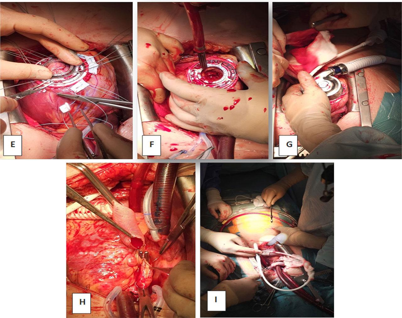 Intraoperative view during LVAD implantation: E - The sewing ring is secured to the myocardium using multiple pledgeted horizontal mattress sutures placed circumferentially; F - A coring device is used to create an opening at the apex; G - The LVAD inflow cannula is inserted through the apical opening and secured to the sewing ring; H - The outflow graft is measured and trimmed to the appropriate length, then anastomosed end-to-side to the ascending aorta using a partial occlusion clamp; I - The driveline is passed through the subcutaneous tissue and brought out through the abdominal wall.