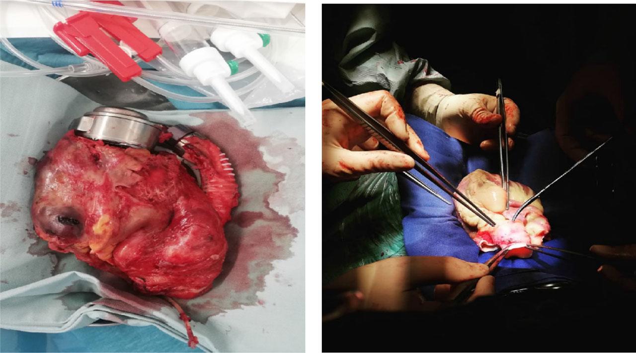 Left picture - Explanted HeartMate 3 LVAD and native heart; Right picture - preparation of the donor heart for implantation.