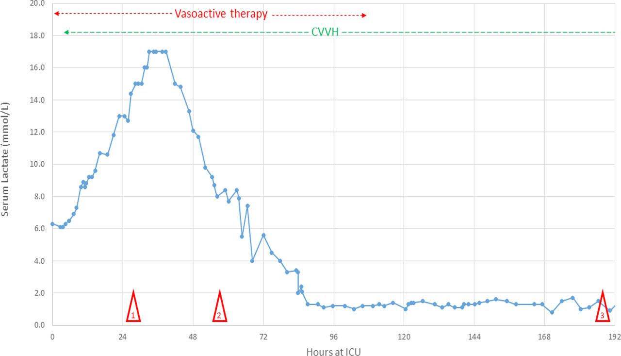 Course of serum lactate during ICU stay. Course of serum lactate, peaking at 17 mmol/L on the second day in the ICU. Vasoactive therapy was discontinued on ICU day five, CVVH on ICU day nine. Mark 1: initiation of chemotherapy; mark 2: onset of disseminated intravascular coagulopathy; mark 3: extubation