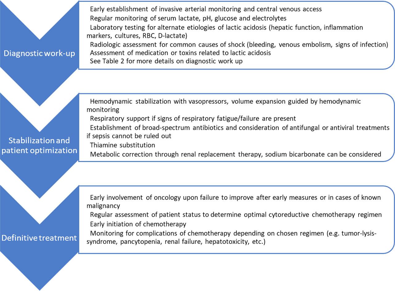 Treatment of this rare cause of LA is a significant challenge, further compounded by the exceedingly high mortality rate of over 90% [17, 18]. While no definitive guidelines have been established, a review of published case reports reveals multiple commonalities in terms of therapeutic approach. Initial management typically involves hemodynamic stabilization with volume resuscitation and vasopressor support to address vasoplegia and the resulting reduction in cardiac output due to acidosis [12, 19, 20]. Early implementation of respiratory support is also frequently indicated due to metabolic acidosis-induced hyperventilation and consequent respiratory fatigue. Metabolic correction is often attempted by combining sodium bicarbonate infusion and renal replacement therapy [21, 22]. However, data regarding the survival benefits of these measures remain limited. Notably, some case reports suggest that large doses of sodium bicarbonate infusion might even stimulate lactate production indirectly through fluid overload and intracellular acidification by accumulation of CO2 [22]. Therefore, these interventions may primarily serve as a bridge until definitive and only causative therapy for malignancy associated LA in form of cytoreductive agents can be initiated. This principle is strongly supported by a larger cohort study, which found that despite often not requiring advanced organ support, prompt initiation of chemotherapy is essential in this vulnerable patient group [7]. However, patient tolerance to chemotherapy may be compromised by poor overall condition, electrolyte imbalances, the underlying acidosis itself, renal dysfunction or hepatic impairment. Early and aggressive interventions to restore homeostasis are crucial to facilitate the initiation of chemotherapy. Early involvement and interdisciplinary cooperation between the intensive care team and oncology are also essential to determine optimal chemotherapy regimen considering the underlying pathology and the patient’s tolerability for chemotherapy. Thus, even after initiation of adequate chemotherapy patients suffering from malignancy-associated LA remain at high risk.