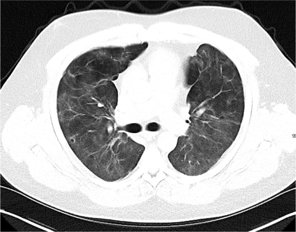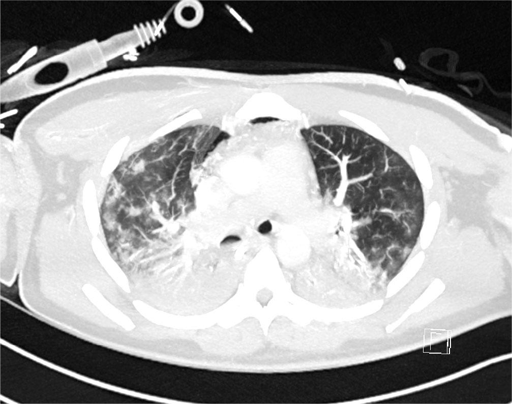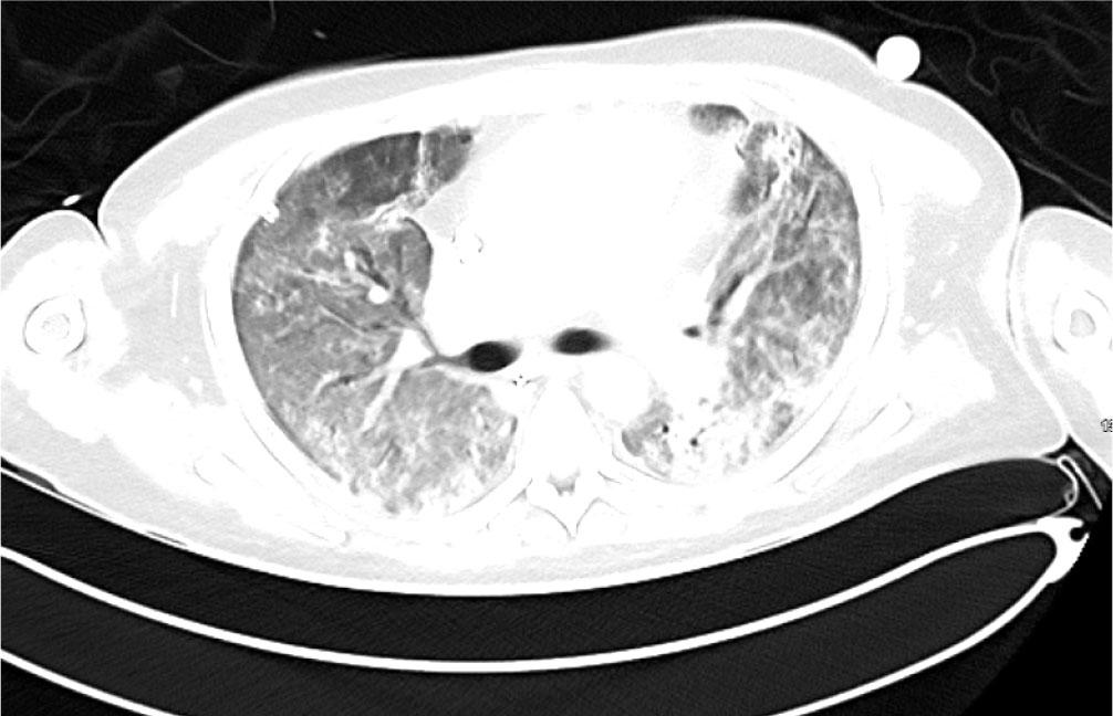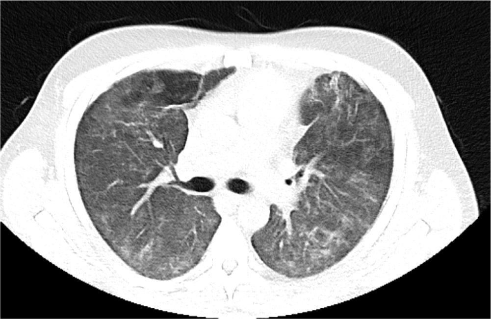 Initial blood tests on transfer demonstrated raised inflammatory markers; CRP 193, White cell count of 20.3 with a predominant neutrophilia. Haemoglobin12.0g/L, platelet count 496×109/L, creatinine 100umol/L, total protein 65g/L. ALT 112 IU/L, ALP IU/L, GGT 226 U/L, albumin 28g/L, total bilirubin 7umol/L. CK was unremarkable at 252 (ref range 44–272). A computed tomography (CT) thorax on transfer to our facility showed extensive bilateral consolidation and surrounding nodular ground glass opacification, in keeping with multi-lobar pneumonia (Figure 1). A bedside echocardiogram was essentially normal. Extensive microbiological investigations including sputum, blood, urine and broncho-alveolar lavage (BAL) culture for bacteria, mycobacteria and fungi, respiratory viral PCR from throat swab and BAL, legionella and pneumococcal urinary antigen yielded no positive results. There was no history of exposure to licensed medications or illicit drugs or factors known to cause lung disease. The presentation was one of severe Type 1 respiratory failure but notably there was no evidence of multi-system organ failure or hemodynamic compromise and hence was an unusual presentation for the initial working diagnosis of CAP with ARDS.