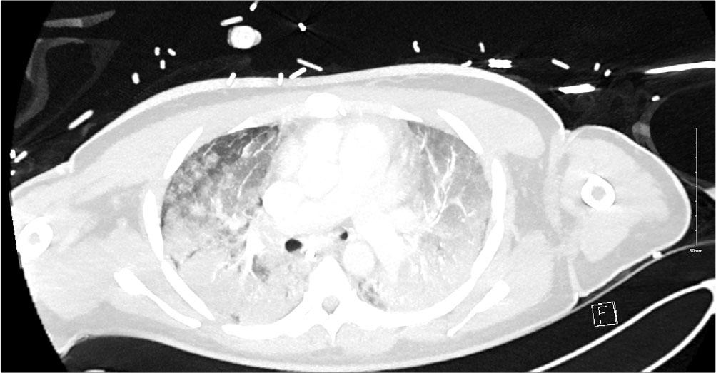 After receiving a course of methylprednisolone (1gm × 3), cyclophosphamide 500mg I.V. and Rituximab 1g the patient improved [2]. This was a transient effect (likely the effect of methylprednisolone) however and on day 15 of admission FiO2 requirements climbed to 1.00 and once again the PF ratio dropped to 9kpa. The patient was unresponsive to prone positioning on this occasion and with the employment of lung protective ventilatory protocols adequate ventilation was difficult to maintain. Given the significant deterioration a repeat CT scan was performed. This showed dense bilateral infiltrates which had significantly worsened since the first CT (Figure 2). The infiltrates were much more extensive throughout both lungs in keeping with ARDS and possible organizing pneumonia. MDT discussion took place, and a decision was made to support with VV ECMO as the pathophysiology was felt to be potentially reversible.