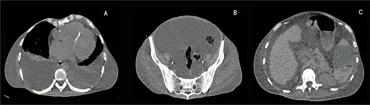 A. Chest CT scan: Large bilateral pleural effusions with atelectasis; Mild pectus excavatum with a Haller index of 2.28; B. Abdominopelvic CT scan: Large amount of ascites; C. Abdominal CT scan: Splenic infarcts