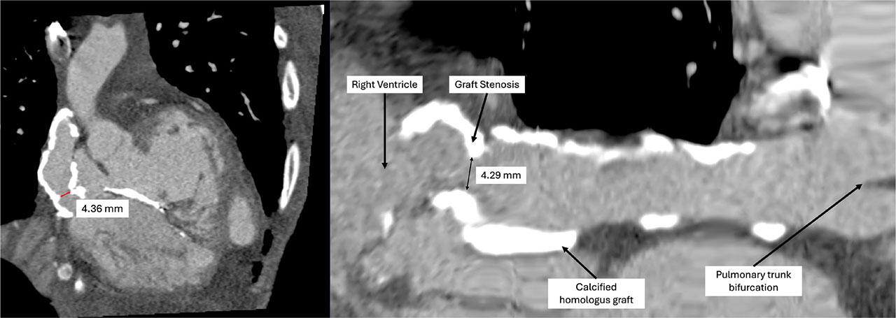 Cardiac CT scan with intravenous contrast: Homograft stenosis-reduction in the diameter of the conduit connecting the right ventricle to the pulmonary artery from 14 mm to 4.29 mm