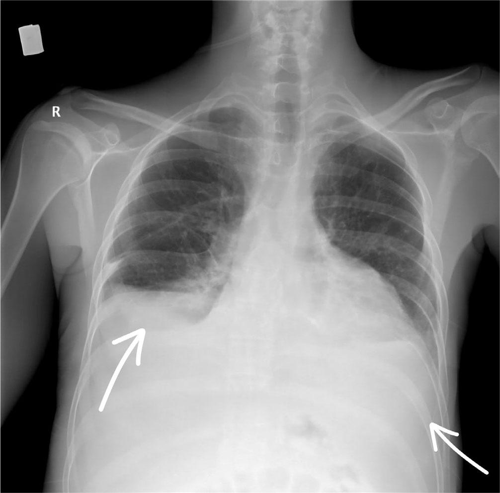 After seven days of antibiotic treatment with Meropenem and Linezolid, the infectious syndrome partially subsided (leucocytes 20×103/μL, neutrophils 17×103/μL, C-Reactive Protein 70 mg/L, fever subsided). However, the patient’s clinical condition deteriorated, with marked dyspnea, tachypnea, oxygen saturation of 80% with non-rebreather mask, hemodynamic instability, heart rate of 125/min and blood pressure of 80/60 mmHg (qSOFA score of 2 points). A central jugular venous catheter was placed, and inotropic and vasopressor support with Noradrenaline 0,05 μg/kg/min up to 0,1 μg/kg/min (Amdipharm, Ireland) was initiated. Analyzing the cause of hypotension, we interpreted the drop in blood pressure as being more in the context of septic shock than cardiogenic shock. Given that septic shock is accompanied by peripheral vasodilation, we chose a positive inotropic agent with a vasoconstrictor effect. Furthermore, we considered that it was unlikely to be cardiogenic shock, as the patient’s echocardiography showed a left ventricular ejection fraction of 45%, which was sufficient to maintain cardiac output at rest. Thoracentesis and paracentesis were performed for therapeutic and diagnostic purposes, with evacuation of 1300 mL of clear serous pleural fluid and 4000 mL of ascites. Bacteriological tests were performed on both pleural and ascitic fluid, but no bacterial growth was detected. After the procedure, oxygen saturation increased to 95% with a non-rebreather mask, and the post-thoracentesis chest X-ray ruled out the presence of new congestive foci and pneumothorax (Figure 4). Given the evacuation of 4000 mL of ascites in a patient with albuminemia of 3g/dL and acute renal failure, we considered the administration of albumin to be inappropriate.