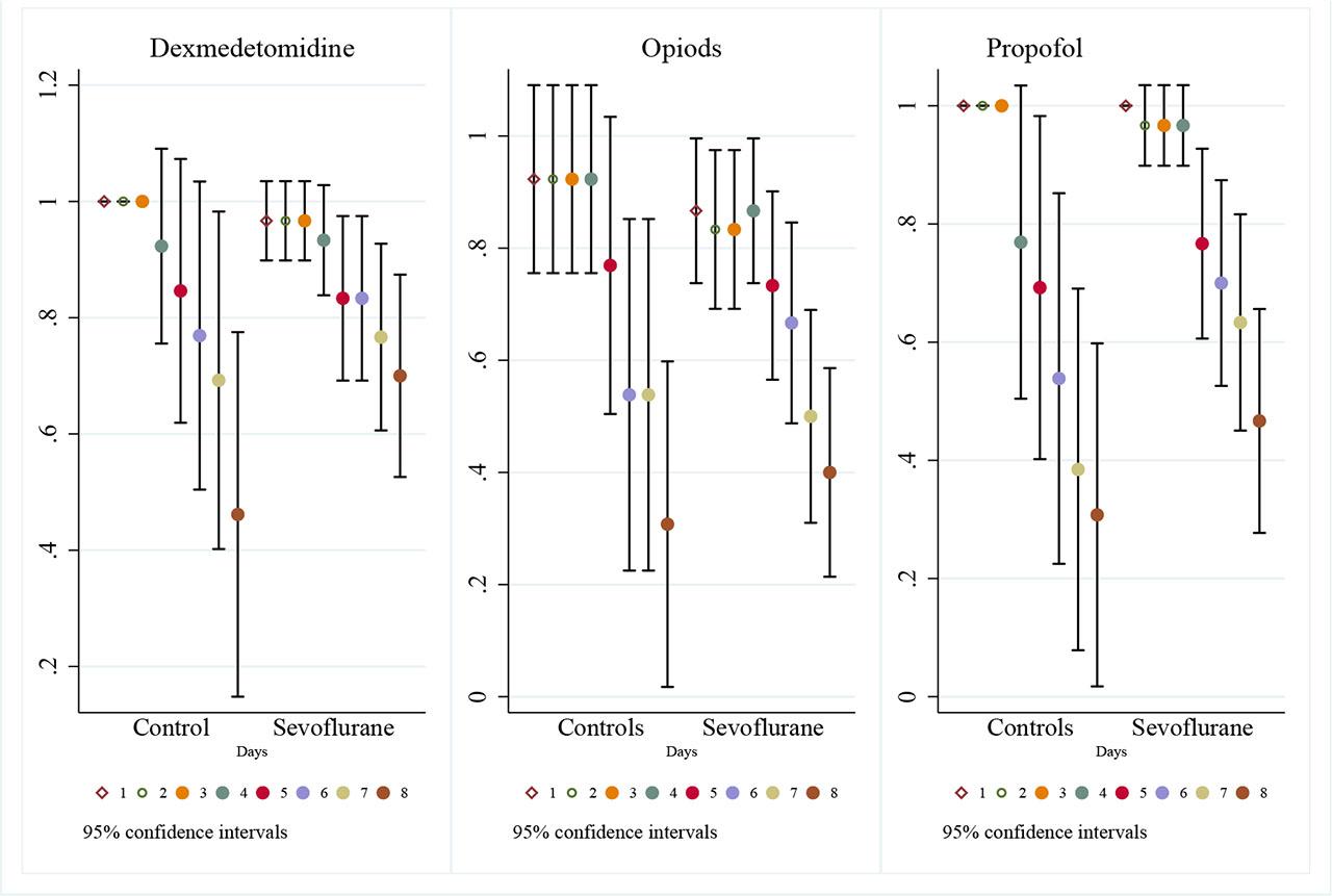 An analysis for each day was performed to compare the mean daily dose of sedatives and the proportion of patients using each sedative between the two groups with Wilcoxon and Fisher’s test respectively. Linear multivariate regression analysis was performed with the cumulative dose of sedatives as the dependent variable, using sevoflurane use as the independent variable and adjusting for other potential confounders (covariates) that differed between groups at baseline with a p<0.05 in the alpha level.