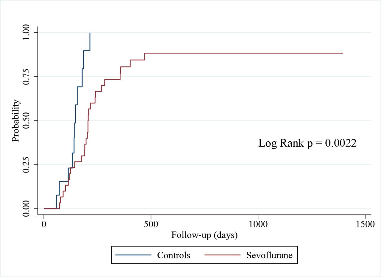 Kaplan-Meier survival analysis was used to estimate the probability of successful extubation, and the log-rank test was used to compare the groups. Logistic regression analysis was performed to assess the association between sevoflurane use and binary secondary outcomes.