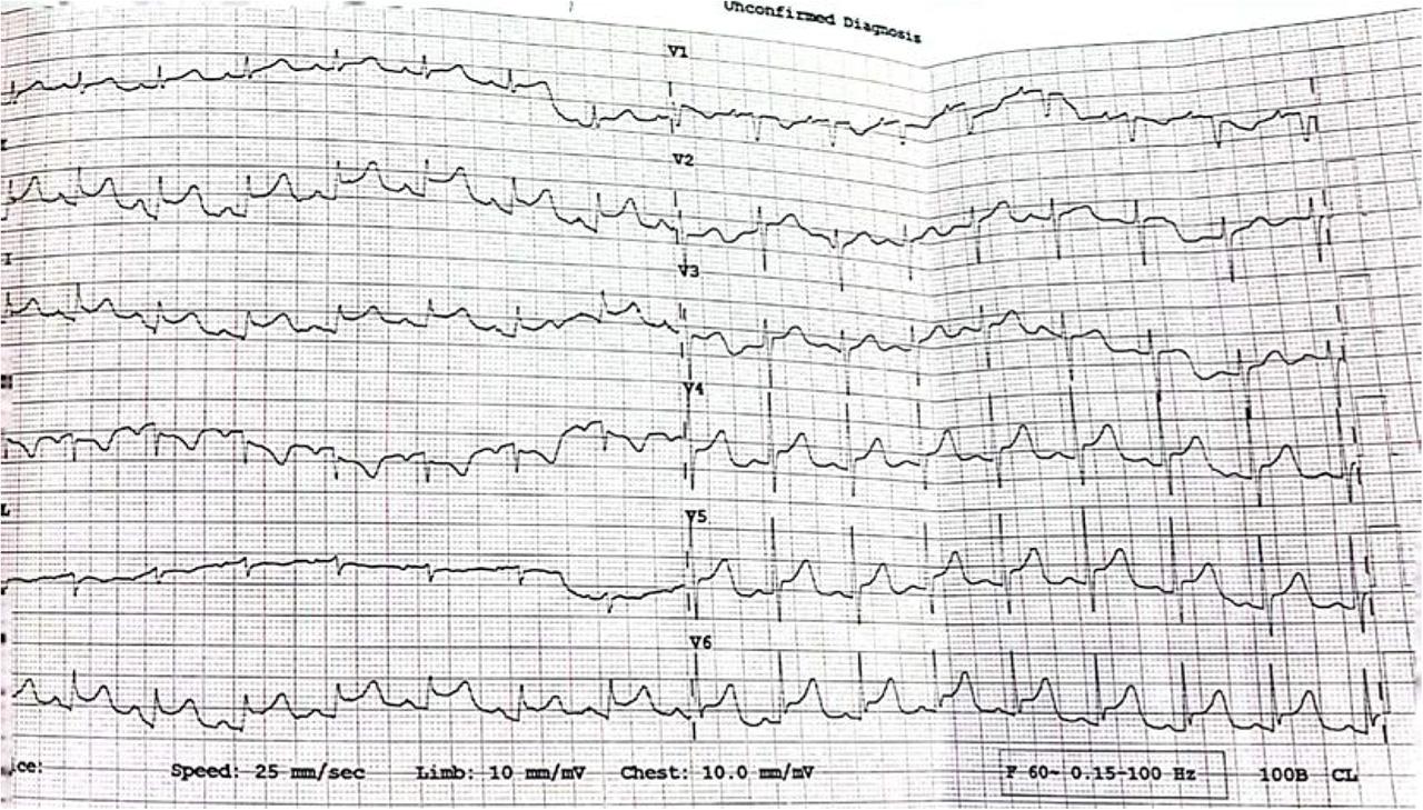 Electrocardiogram showing ST elevation in inferolateral leads