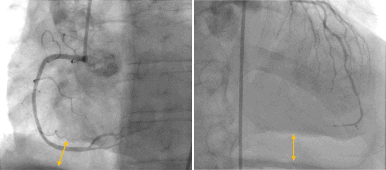 Coronary angiography showing normal coronary arteries. Hydroaeric image lining the inferior edge of cardiac projection (arrows)