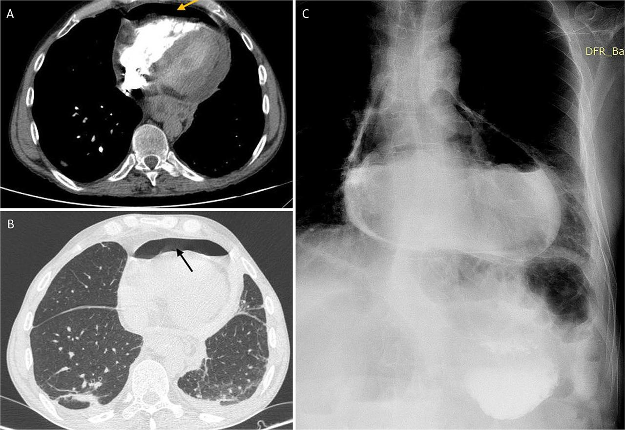 A,B. CT scan, hydropneumopericardium. C. Extravasation of contrast in the pericardium during the Gastrografin study