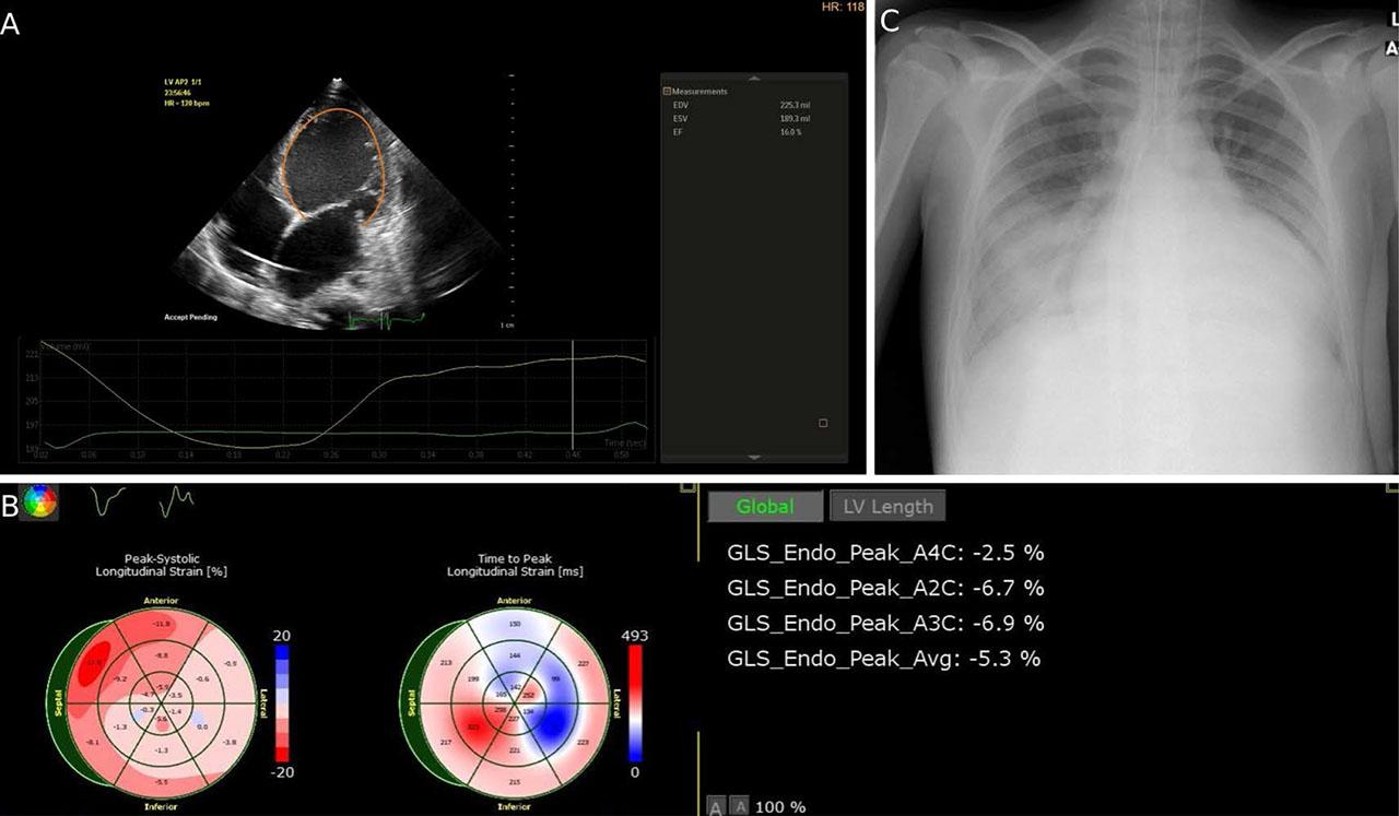 Severe left ventricular dysfunction. A. Severely dilated LV with impaired systolic function (auto 2D quantification). B. Decreased LV global longitudinal strain (GLS) C. Chest radiograph revealing pulmonary edema.