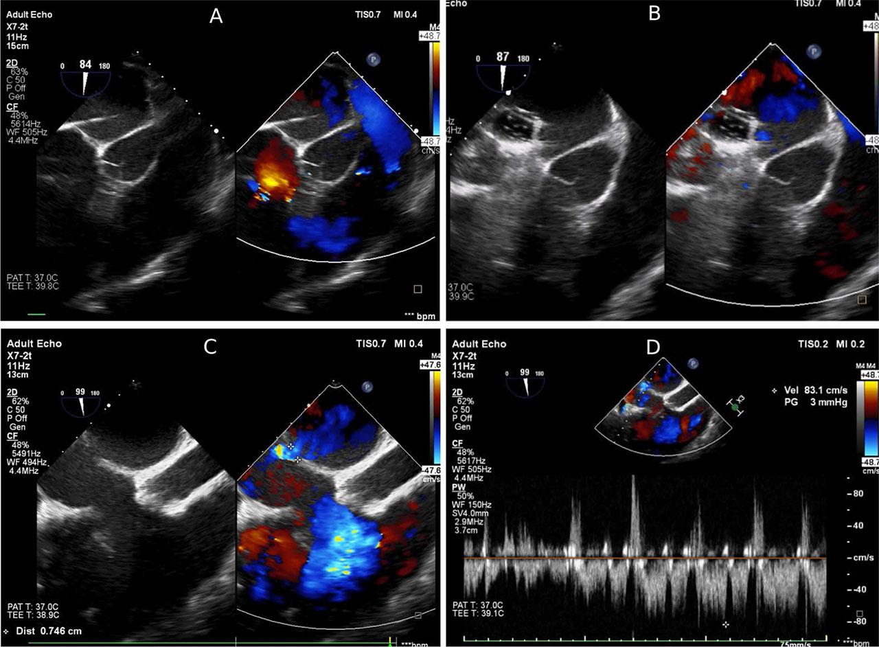 Echocardiography-guided transseptal puncture through the interatrial septum. A. Transseptal needle. B. Balloon dilation of the interatrial communication. C. Doppler color-flow in atrial septal defect. D. Pulsed-wave Doppler revealing unrestrictive atrial septal defect.