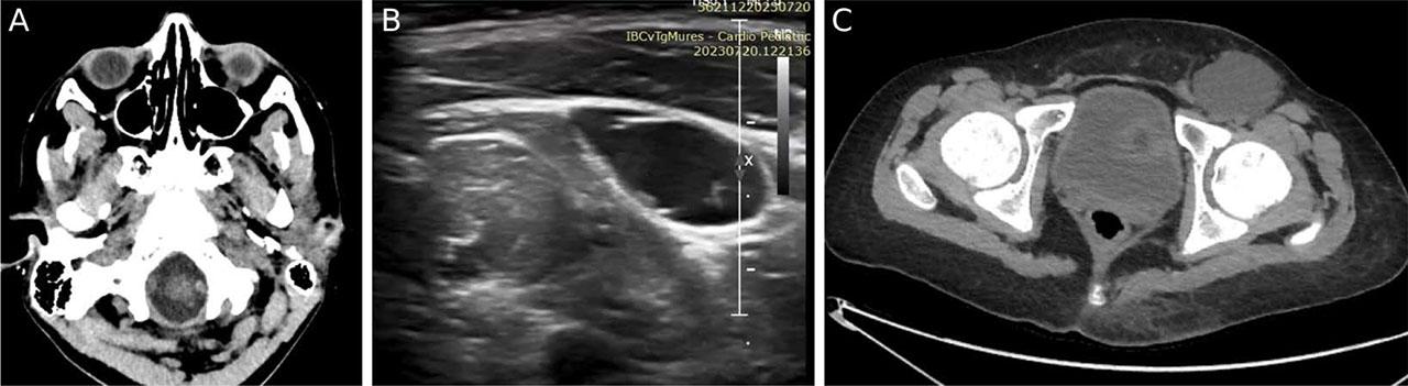 Two weeks after the heart transplant, a fluctuant collection became visible in the left inguinal region. Ultrasound and CT imaging revealed a large, thin-walled fluid cavity, suggestive for seroma (Figure 3B,C). It was drained by two needle puncture aspirations, but with recurrence. Hence, a surgical excision with hemostatic material was necessary, with total remission of the seroma afterwards. The patient also developed venous thrombosis at multiple sites (right jugular vein, left subclavian vein). In this context, thrombophilia testing was performed, which revealed heterozygote mutation for the MTHFR and PAI-1 genes. Anticoagulant treatment with heparin was initiated, which was later changed to enoxaparin and then to apixaban, with resolution of the thrombi.