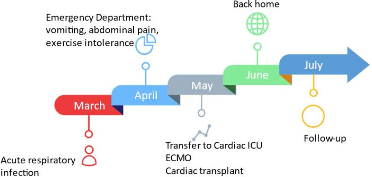The first endomyocardial biopsy performed 1 month after the heart transplant showed an ISHLT score of 0, and afterwards the patient was discharged and followed as an outpatient. The patient’s medical history timeline is presented in Figure 4.