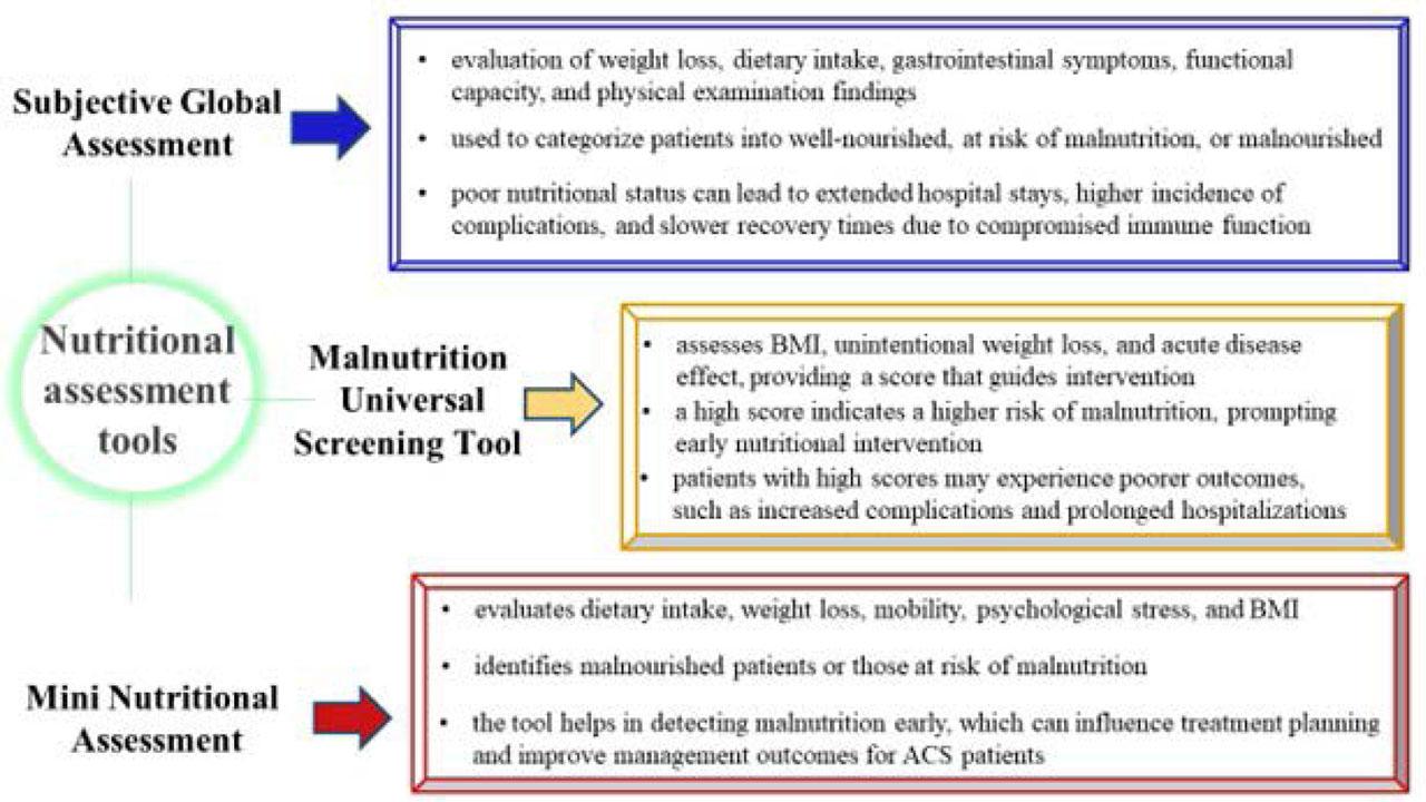 Figure 1 presents some of the most widely used nutritional status assessment tools and their clinical relevance in ACS,12,34 while Figure 2 shows the nutritional intervention strategies and their impact on ACS.12,34,95,96,97