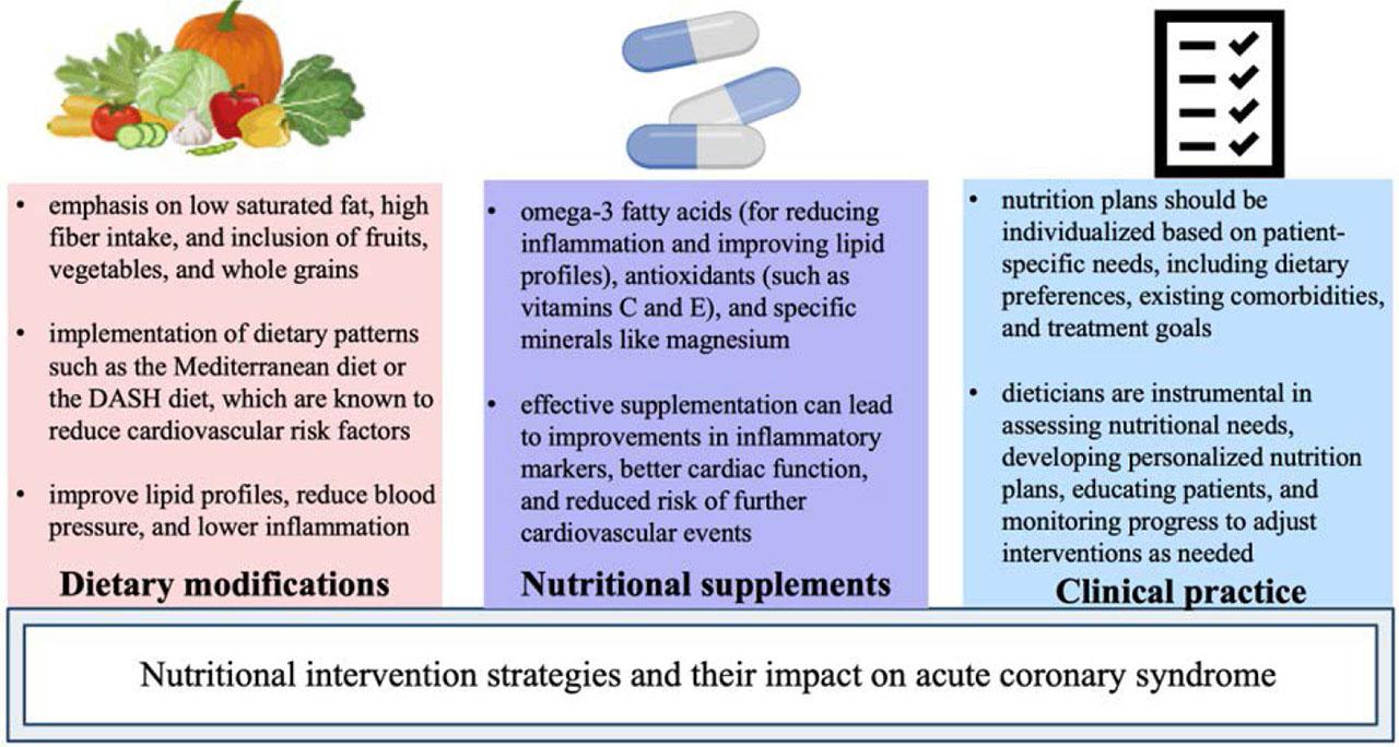 The aim of the present narrative review was to conduct a critical assessment of the influence of nutritional status, dietary patterns, and targeted nutritional intervention strategies on the management of ACS and inflammation. It highlights the need for comprehensive nutritional status assessment in hospitalized patients, particularly those with cardiovascular conditions, using validated tools.13 The article advocates for a multidisciplinary approach, including dietitians in healthcare teams, to enhance patient outcomes, reduce complications, and improve quality of care through targeted nutritional interventions.