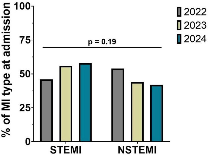 This study analyzed trends in the management of AMI over three consecutive first quarters (Q1 2022, Q1 2023, Q1 2024), including a total of 722 patients. The distribution of patients by year was as follows: 225 in Q1 2022, 239 in Q1 2023, and 258 in Q1 2024. Among these, the number of STEMI cases was 104 in 2022, 135 in 2023, and 134 in 2024 (Figure 1).