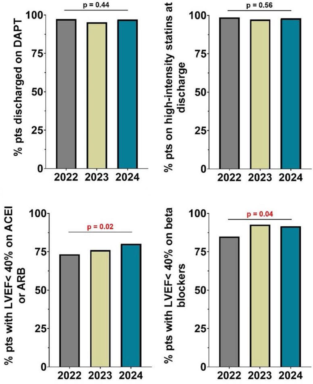 The percentage of patients discharged on dual antiplatelet therapy remained high throughout the study period, ranging from 95.28% to 97.33%, but the differences between quarters were not statistically significant (p = 0.44; Figure 2A). Similarly, the use of high-intensity statins at discharge was consistently high (97.27% to 98.67%), with no statistically significant variation observed across the three periods (p = 0.56; Figure 2B). Among patients with left ventricular ejection fraction (LVEF) < 40%, a statistically significant increase was observed in the prescription of ACE inhibitors or ARBs, rising from 73.33% to 80.17% (p = 0.02; Figure 2C). A similar statistically significant trend was noted in beta-blocker use within this subgroup, increasing from 84.89% to 91.60% (p = 0.04; Figure 2D).