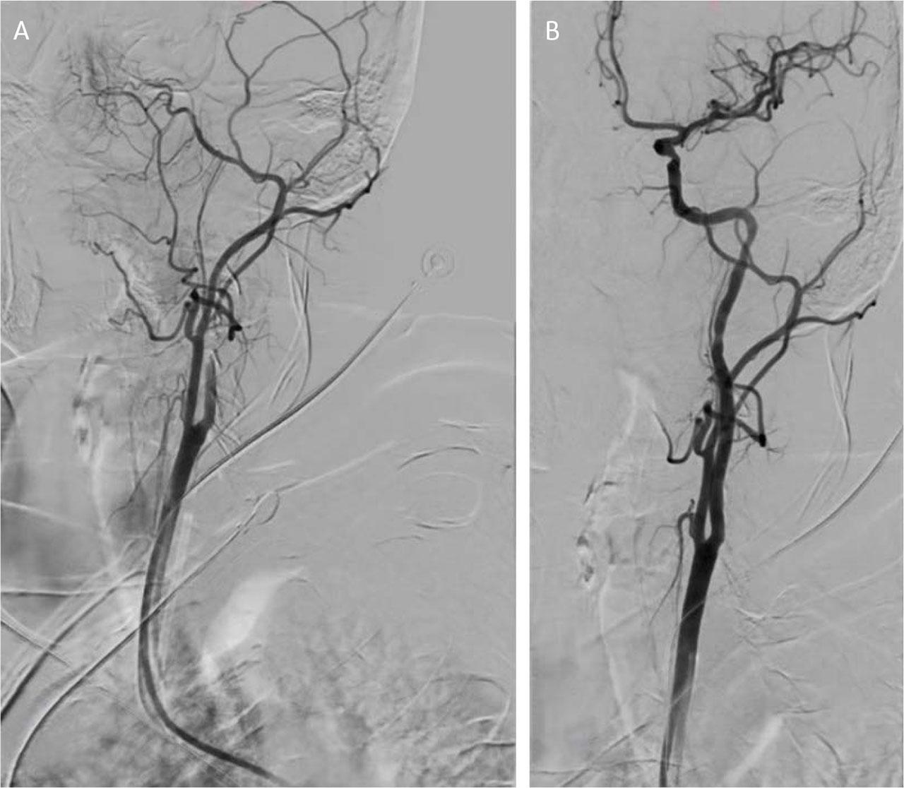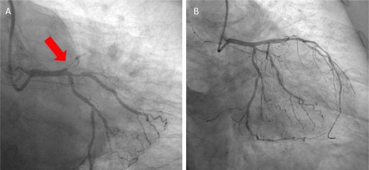 Left coronary artery angiography. A. Acute thrombosis on the left descending anterior artery. B. Post drug eluting stent implantation.