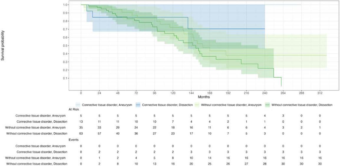 The Kaplan–Meier method and the log-rank test were used to calculate and compare survival estimates for patients with aortic aneurysms and aortic dissections. In the CTD cohort, 1-year survival was 89% (100% for aortic aneurysm and 85% for aortic dissection). The 1-year and 10-year survival did not change, all patients survived. The differences in survival rates between patients with aortic aneurysm and aortic dissection were not statistically significant (p = 0.21).