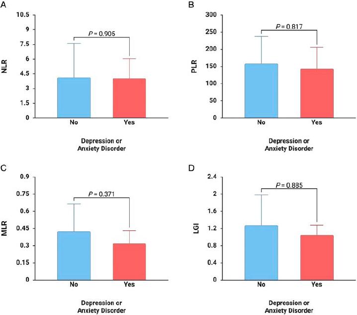Differences between patients with and without depression or anxiety disorders for NLR (A), PLR (B), MLR (C), and LGI (D).