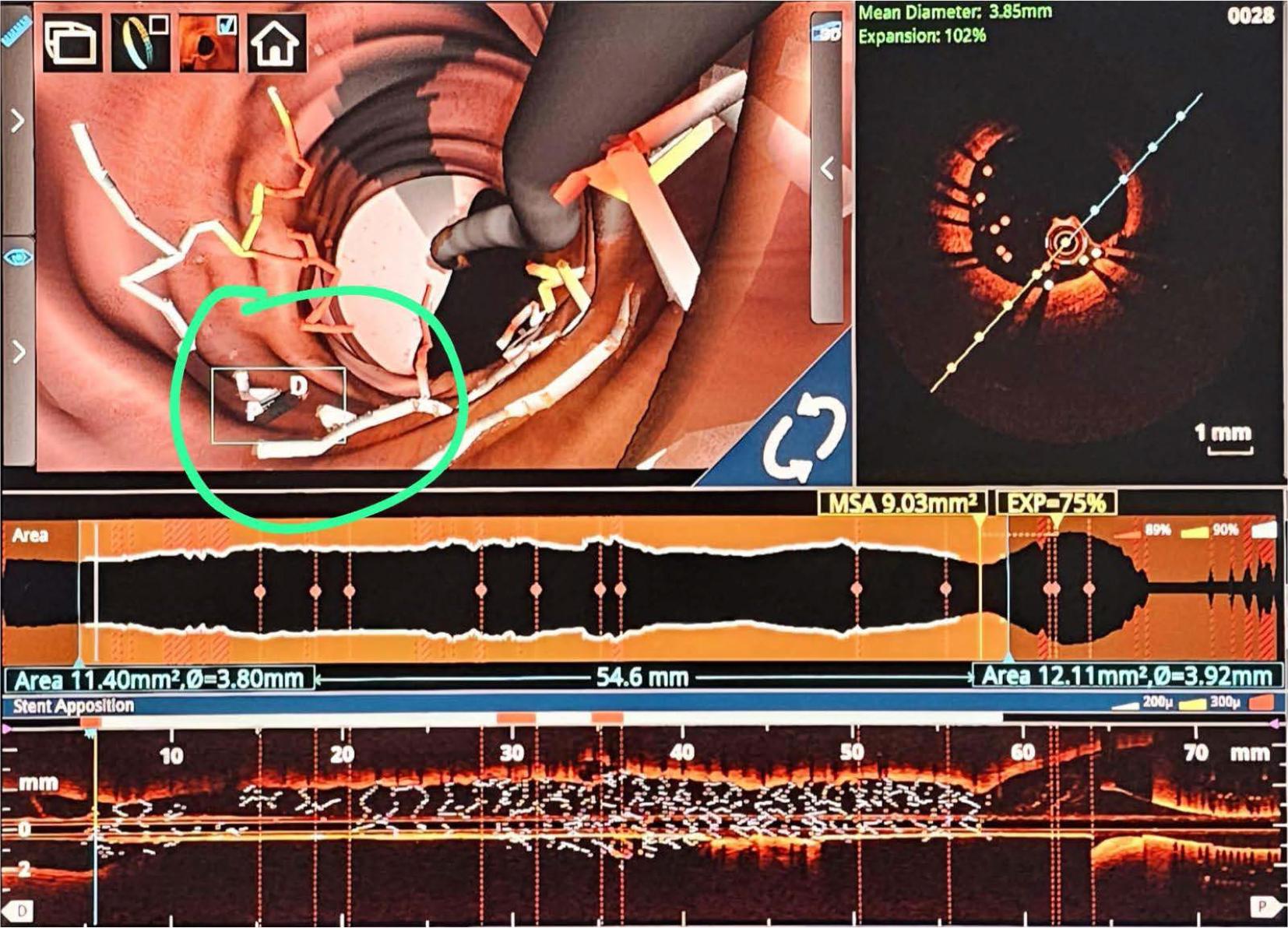OCT with 3D reconstruction. Severe malposition of the stent requiring 1:1 noncompliant balloon post dilatation.