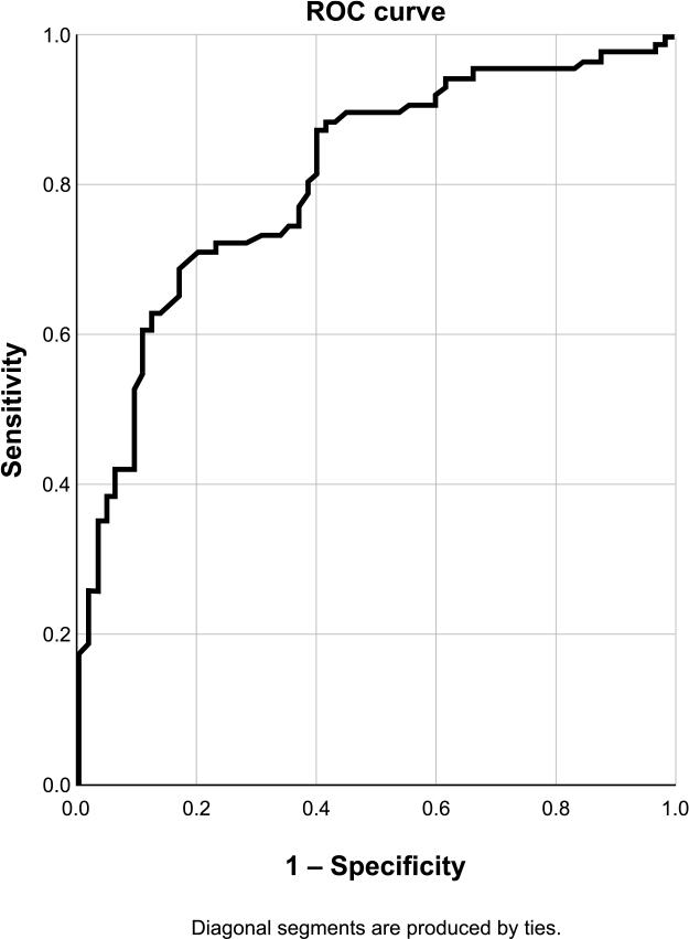 ROC curve for MLA in the LAD. Sensibility 78.3%, specificity 75.8%, accuracy 77.2%.