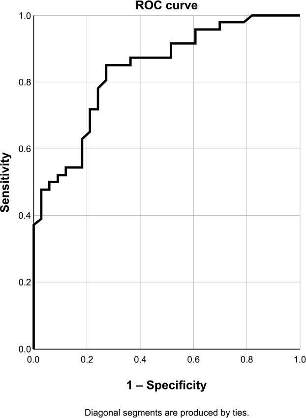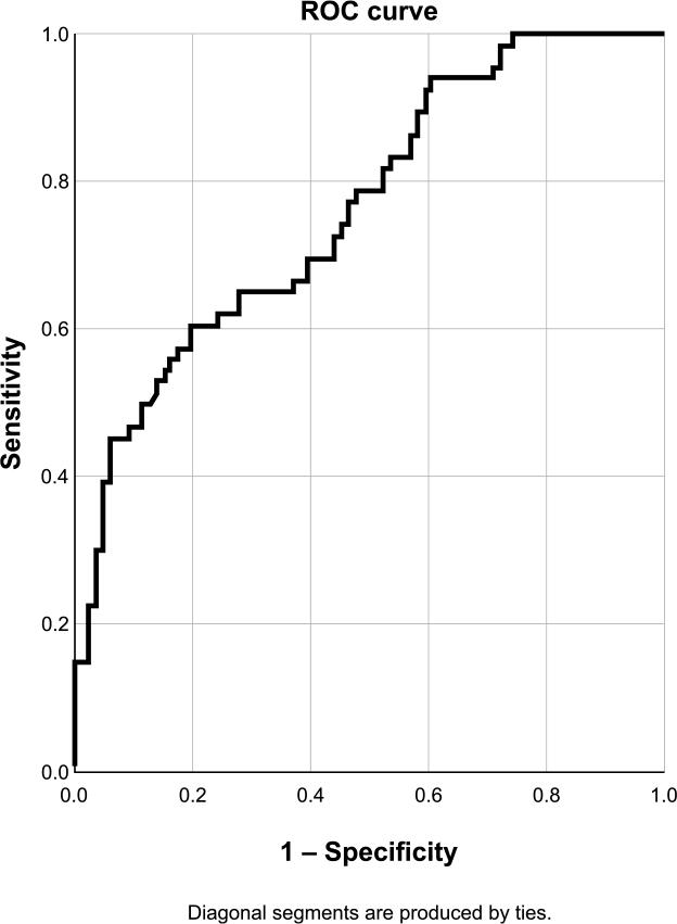 ROC curve for OCT-derived MLA to predict FFR < 0.8. Sensibility 83.1%, specificity 68.6%, accuracy 74.8%.