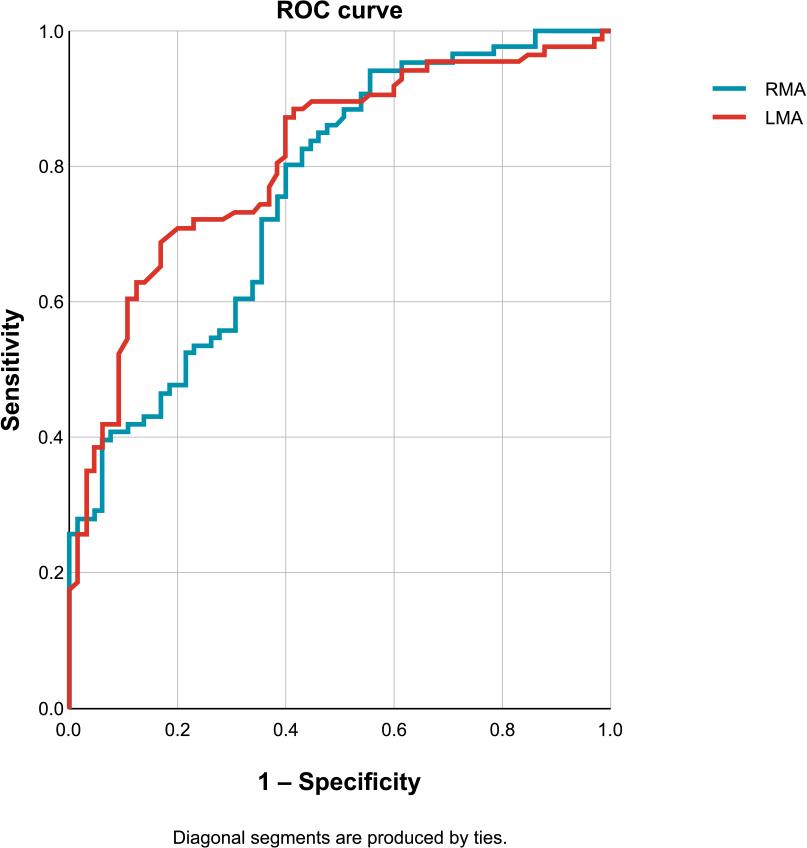 For the LAD (Figures 5 and 6), a cut-off value for MLA of 2.23 mm2 and for PAS of 65.3% were obtained.