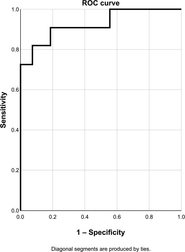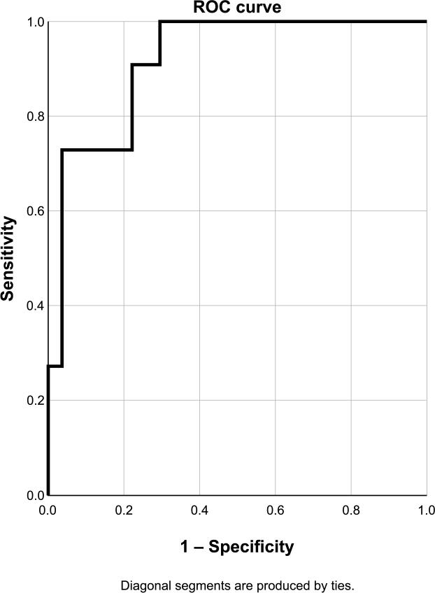 ROC curve for PAS in the LAD. Sensibility 91.3%, specificity 51.5%, accuracy 74.7%.