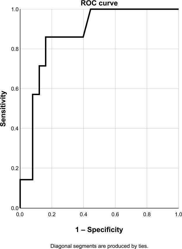 ROC curve for PAS in the RCA. Sensibility 100.0%, specificity 33.3%, accuracy 52.6%.