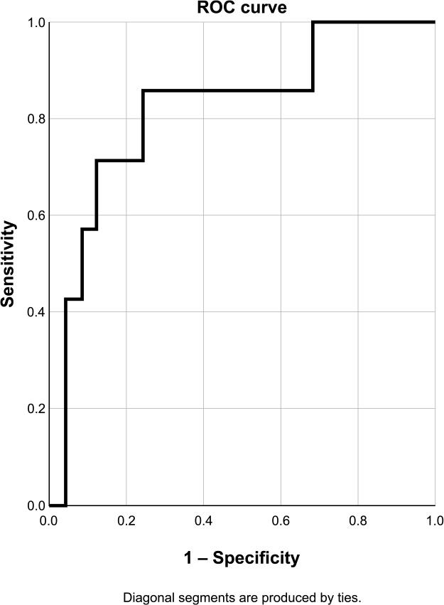 ROC curve for PAS in the CX. Sensibility 85.7%, specificity 76.0%, accuracy 78.1%.
