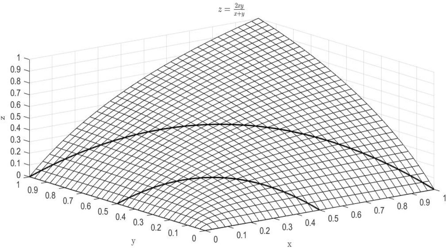 The F-measure, considered a mathematical function, depends on two variables x = OCD/OD (the country’s share in the world’s publication in domain D) and y = OCD/OC (the domain’s share in the country’s publication output). As a function of x and y we have: