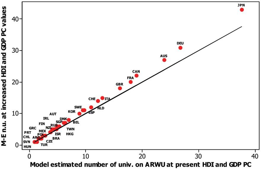 Model-estimated (M-E) number of universities (n.u) on ARWU before vs after raising GDP per capita and HDI by 10%.