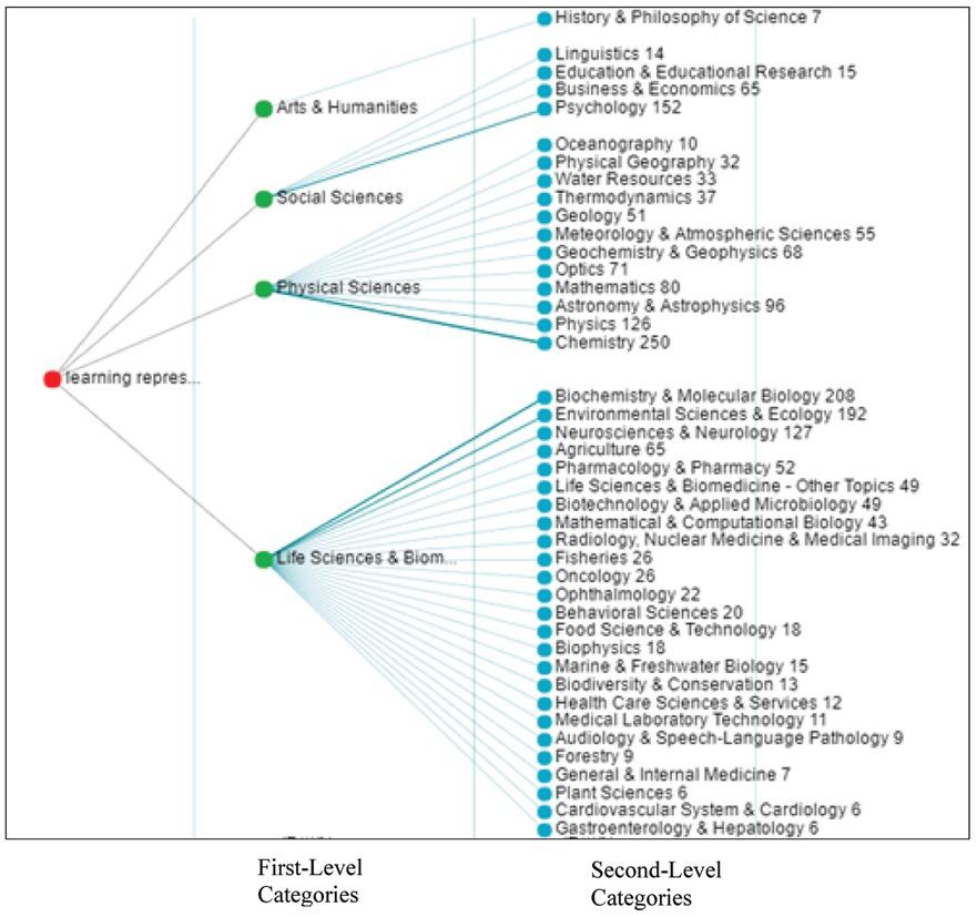 Changes in research topics of follow-up citing authors since 1987 when Hinton published the paper are shown in Fig. 5. Specifically, persistent ones include propagate error and representation. Afterward, the number of persistent research topics increases every five years and the research scope involves many new AI-based fields, such as pattern recognition, classification, prediction, computer vision, image analysis, knowledge extraction, sentiment analysis, speech recognition, Convolutional Neural Network (CNN), Recurrent Neural Network (RNN), language model and reinforcement learning (RL). Meanwhile, the research result quickly transferred to other disciplines (WoS Discipline Category, Fig. 6): four first-level disciplines, including Life Sciences, Physical Sciences, Social Sciences and Arts & Humanities, realizing 100% cross-discipline. It’s worth noting that 42 second-level disciplines enjoy the citing frequency that is greater than five. It is safe to conclude that the representative work’s research result not only greatly impacts on its own field, but also is widely used in many fields of other disciplines. Objectively, this reflects the actual academic value of the representative work.