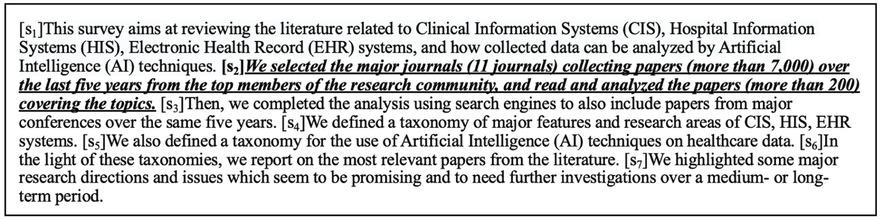 For example, the second sentence (s2) of the abstract shown in figure 1 is annotated with “Methods”, and the data format after this process step is shown in table 1. We use this representation to learn the internal features of the sentence.