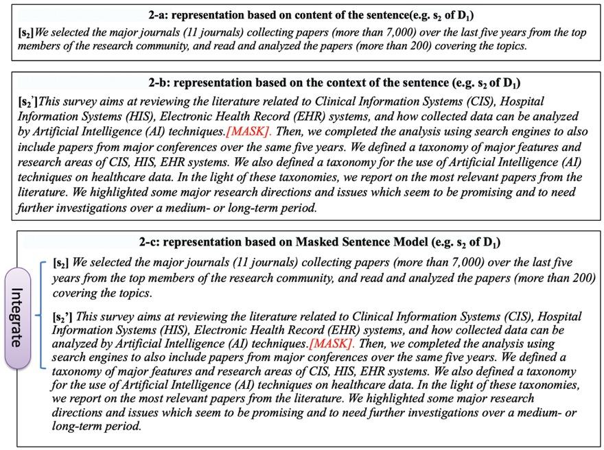 In step 2, we obtain the contextual information of each sentence in the abstract. Here, we adopt a new method that simply uses the whole abstract except for the target sentence, which is replaced by a [MASK] string to obtain the contextual information. In this paper, we replace each word of the target sentence with “aaa” characters to build the meaningless string of [MASK].