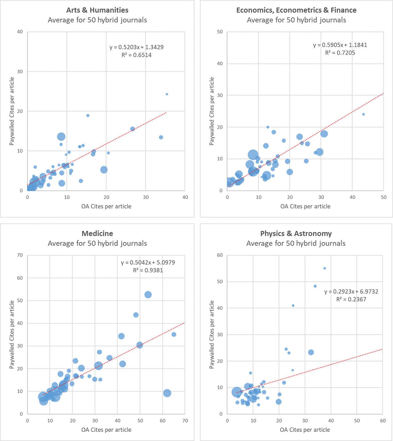 As previously commented, there is a strong and positive linear correlation for cites per article in both hybrid modalities (see Figure 1). The coefficient of determination is generally high, with the exception of Physics & Astronomy. The hybrid journals with the greatest impact in one modality are also in the other. The bisector of the square, that is, the imaginary line that begins in the lower left corner and ends in the upper right corner of the square, separates the citation advantage for each modality. The bubbles below the bisector correspond to hybrid journals with citation advantage for the OA modality. Similarly, the bubbles above the bisector correspond to hybrid journals with citation advantage in the paywalled modality (citation disadvantage for the OA). Note in all the areas there is a majority of journals below the bisector, where the citation advantage corresponds to the OA hybrid modality. In fact, the regression line falls below the bisector in all cases, that is, the OA citation advantage in hybrid journals is observed even in the least squares estimate.