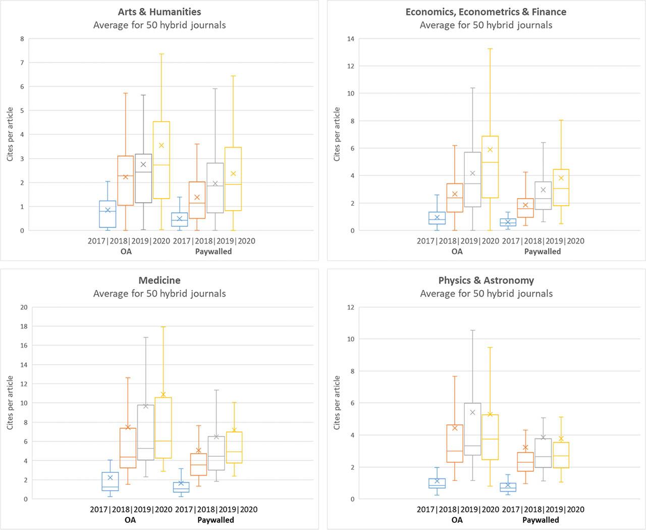 The box diagram for the average of cites per article in hybrid journals, according to modality and year of citation, is show in Figure 2. In all subject areas and each citation year, cites per article for those in the OA modality are clearly higher than the citations in the paywalled modality. These average citations for the OA modality are higher both in mean (indicated with the x symbol) and in quartiles of the distribution (box and whisker). Note that the mean of the distribution is considerably larger than the median. This is because the distribution is asymmetric with a long tail on the right.