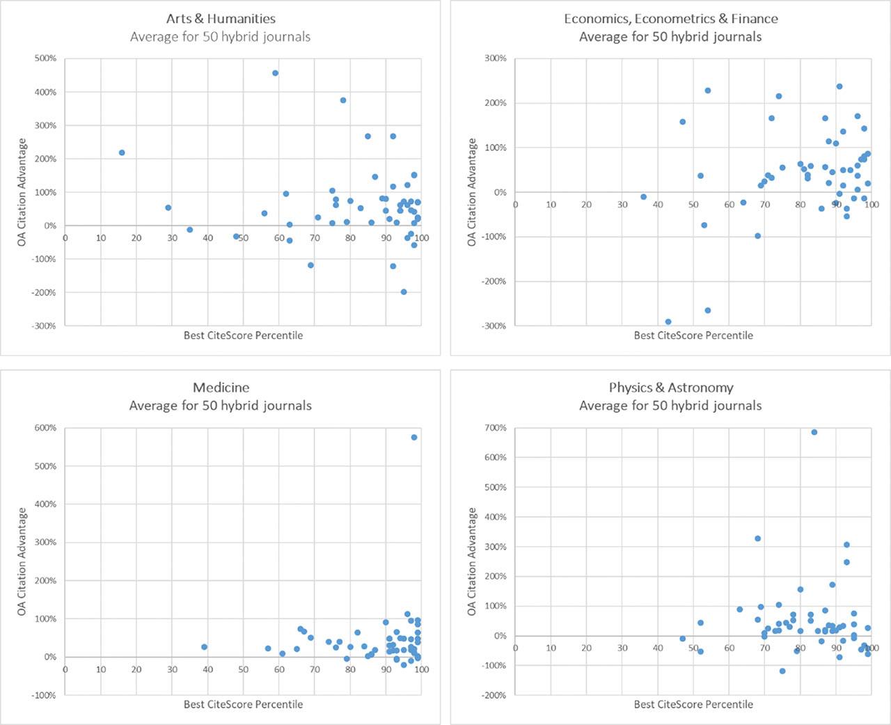 The OA prevalence either does not correlate with cites per article in the hybrid modalities. However, the position of the journal in the citation ranking (percentile) correlates weakly with cites per article in both hybrid modalities.