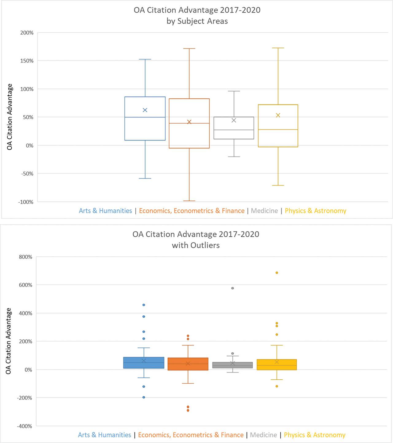 Figure 4 shows the OA citation advantage by subject areas, with and without outliers. Note the citation advantage of the OA modality in hybrid journals is clear for all subject areas. The data distribution, represented by the box and whiskers, displaces toward the positive part of the vertical axis. The median of the distribution (the inner line that divides the box into two parts) is in the range 25–50%, while the mean is in 40–60%. There is a citation advantage in more than 75% of the journals. Thus, the 25th percentile (the bottom line of the box) is located close to 0% in the worst case (Economics, Econometrics & Finance). Furthermore, the OA citation advantage is consistent across fields (Figure 4) and held in time (Figure 5).