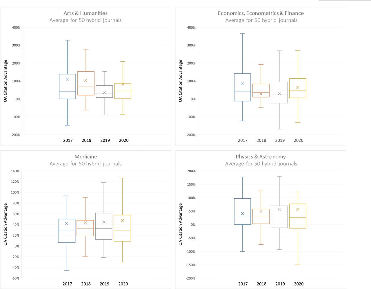 Thus, we can conclude that the citation advantage of the OA modality in hybrid journals, in relation to the paywalled modality, is around 50.3% in average for the 200 journals and four years in the sample, and higher than 36.8% in half of the journals. Moreover, this OA citation advantage held in time. Finally, the highest OA citation advantage is observed in Arts & Humanities.