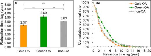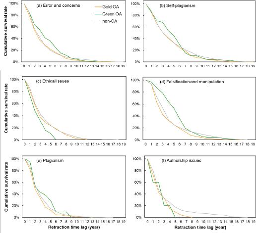 (3) The retraction time lag of Gold OA was the shortest, and that of Green OA was the longest, rather than non-OA as expected. The reason for the long retraction time lag of Green OA could be partly explained by the abnormal proportion of reasons for retraction.